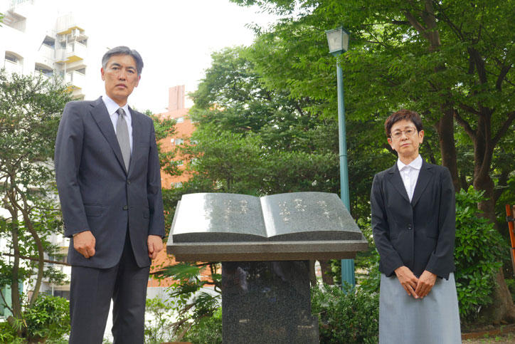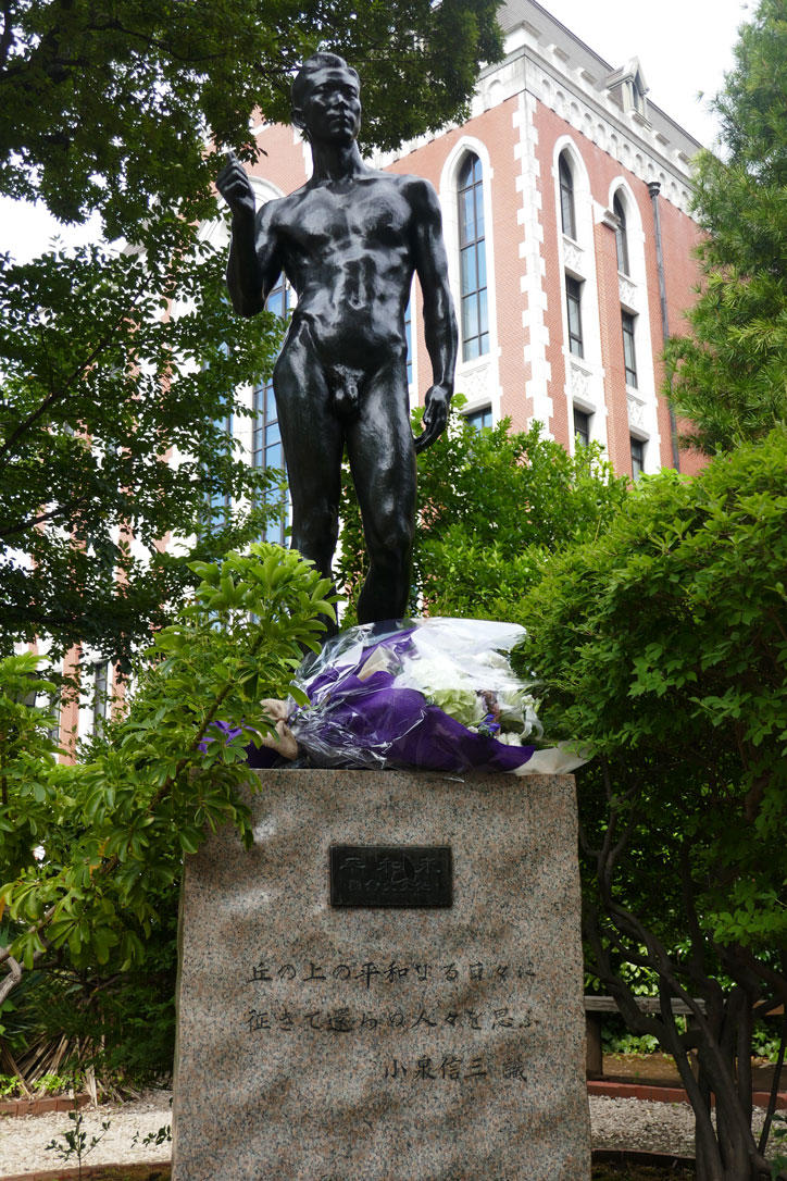 A sculpture of a young man, "Heiwa Kitaru," whose name translates as "peace has come," stands in front of the Jukukan-kyoku (Keio Corporate Administration) on Keio University's Mita Campus. On August 15, 2022, the anniversary of the end of World War II, Chief Administration Officer Toshiko Hirota and I laid flowers at the foot of Heiwa Kitaru. The statue is inscribed with the following words of tribute to the Keio students who lost their lives from Shinzo Koizumi, who was Keio President during the war.