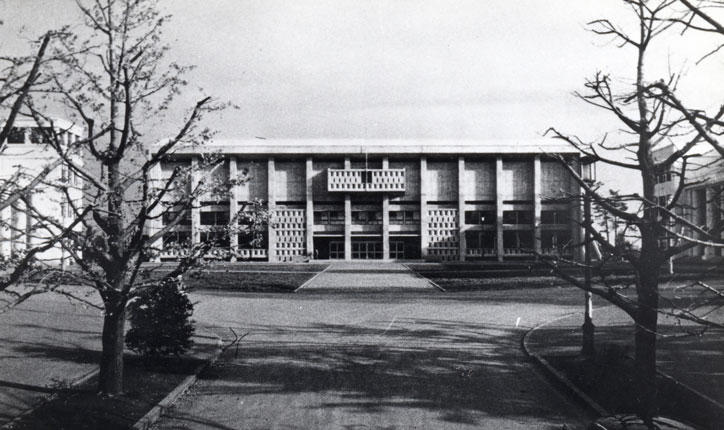Construction of the Hiyoshi Commemorative Hall progressed rapidly after the groundbreaking ceremony in March 1958, concluding just seven months later in October of the same year. The impressive steel-framed reinforced concrete structure capped the end of a ginkgo-lined promenade. With three floors above ground and one below, the scale of the building was massive at a total area of about 6,000 square meters. Other features included a sizeable ground-floor gymnasium and auditorium where the stage and the bleachers faced each other. The gymnasium could transform into a ceremonial venue with bleachers and seats lining a court that could hold as many as 10,000 people, including standing room. An auditorium of this size was unprecedented and the first of its kind in Japan.