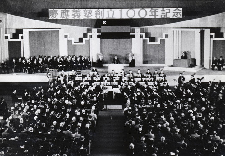 The Keio University Centennial Ceremony was held at the Hiyoshi Commemorative Hall on November 8, 1958, and was attended by 4,654 people from Japan and overseas, including Emperor Showa, the presidents of the University of Tokyo and Waseda University, and by representatives from Harvard University. As the first modern educational institution in Japan to celebrate its centennial, there was a great deal of public interest, and even a commemorative postage stamp was issued in Keio’s honor. At the ceremony, Japan's Minister of Posts and Telecommunications presented the first printed sheet of these stamps to then Keio president Fukutaro Okui.