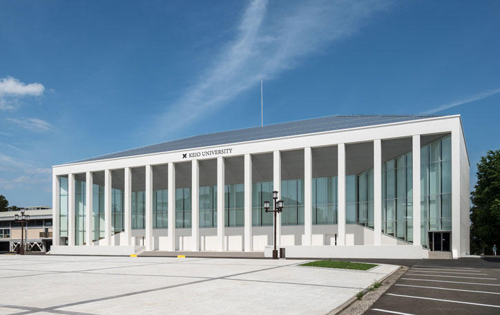 The symmetrical, stark-white facade of the New Hiyoshi Commemorative Hall blends well with the First and Second Buildings, which stand adjacent at the top of the ginkgo-lined promenade. Together, these buildings act as a beautiful foil for the natural scenery of the four seasons on campus. This brand-new structure builds upon the storied history of the hall that came before it to write a new chapter in the annals of Hiyoshi Campus and Keio University.