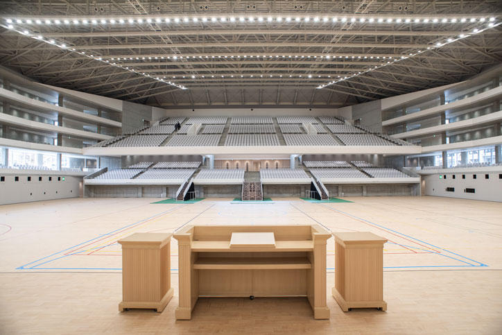 Plans resumed in October 2017, and after two and a half years of construction, the New Hiyoshi Commemorative Hall was completed on March 10, 2020. The new building has four floors above ground and two below with a total floor area of 12,500 square meters, more than twice that of its predecessor. Total capacity has also increased from around 6,500 to approximately 10,000 people, not including standing room. But it's not only the scale of the new building that is so impressive. There are new accessible viewing spaces for wheelchair users, and the facility boasts state-of-the-art heating, ventilation, and air conditioning to ensure visitor comfort.