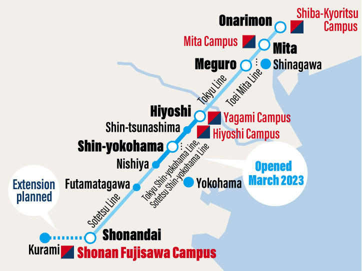 With the opening of the Sotetsu&Tokyu Shin-Yokohama Line in March 2023, direct travel between Hiyoshi Station and Shonandai Station is now possible without needing to change trains. There are currently plans to extend the Sotetsu Izumino Line from Shonandai Station to Kurami Station on the JR Sagami Line via SFC, further improving access between SFC and other campuses.