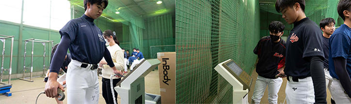 Matsudaira participates in the Sports Science Lab, where they regularly analyze players’ body composition using the same devices used by medical professionals, evaluate performance using force-velocity profile, and perform running tests utilizing phototube sensors. Body composition analysis gathers physiological data— including water and protein levels and the amount of muscle and fat in different parts of the body—to obtain data for training and, in consultation with laboratory staff, create practice regimens for the players.