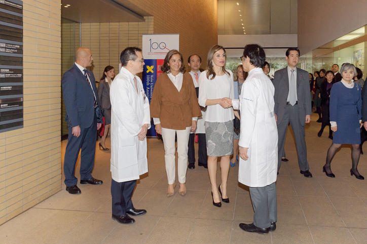 Officials, such as the Spanish State Secretary for Research, Development and Innovation Carmen Vela Olmo of the Ministry of Economy, Industry and Competitiveness, and staff members of the Spanish embassy accompanied the queen on the tour of Keio University Hospital to take a look at how the university is engaged with the latest in medical care.