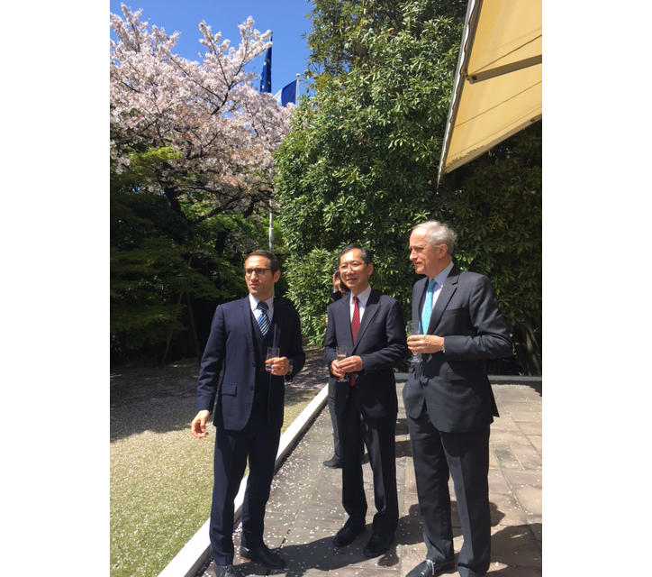 On Wednesday April 12, a signing ceremony was held at the Embassy of France in Tokyo for a Memorandum of Understanding for a new double degree program between ESSEC Business School (hereafter “ESSEC”) and the Keio University Faculty of Business and Commerce. Present at the ceremony on the Keio side were Professor Kengo Sakakibara, Dean of the Graduate School of Business and Commerce, and Professor Masahiro Endo of the Faculty of Business and Commerce, and from the ESSEC side was Associate Professor Christian Koenig, the Associate Dean of International Affairs. Also in attendance was Mr. Pierre Colliot, Counsellor for Culture and Cooperation at the French Embassy in Japan, who gave a speech on behalf of the embassy, denoting the high expectations for the program.