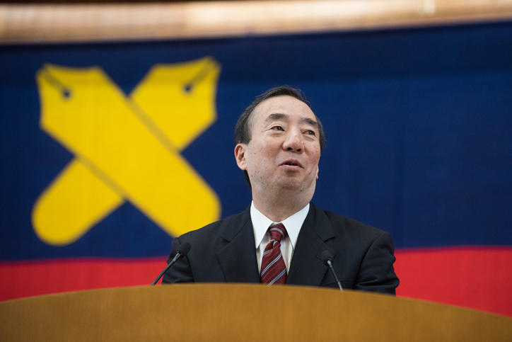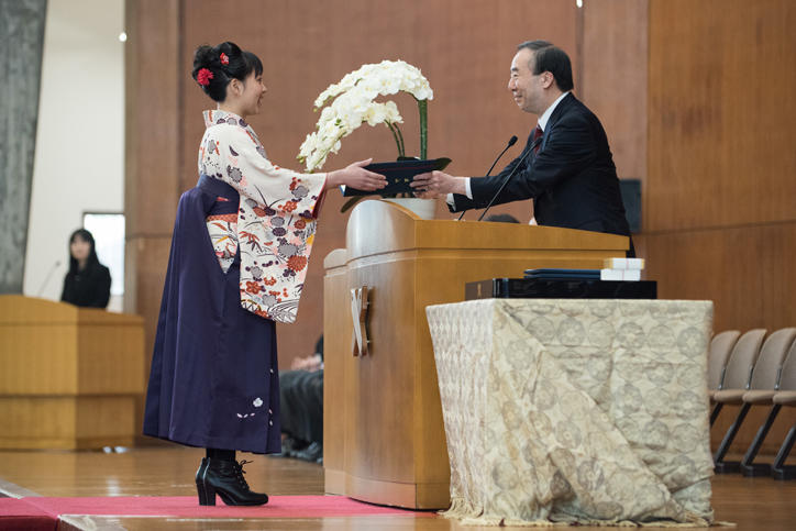 The ceremony began with Vice-President Akira Haseyama’s Graduating Class Report, followed by the presentation of awards and diplomas and the congratulatory address to Keio’s newest graduates by President Atsushi Seike. In his address, the president spoke about the importance of seeking the truth without being constrained by fixed ideas and dogmas, and cited a sentence from Yukichi Fukuzawa’s book An Encouragement of Learning: “There is much that is false in the realm of belief, and much that is true in the realm of doubt.” Mr. Motoyuki Oka, Senior Adviser of Sumitomo Corporation, represented Keio alumni and gave his congratulatory address, and a new graduate of the Faculty of Business and Commerce, Honoka Tsuda, gave a speech on behalf of the graduating class.
