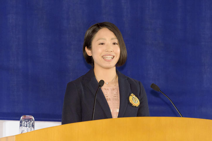 This was followed by congratulatory speeches from Hirokazu Matsuno, Minister of Education, Culture, Sports, Science and Technology, Kaoru Kamata, president of Waseda University, and Toshihisa Nagura, chairperson of the Mita Athletic Association. Then, 43 messages for “ensuring the future of student sports”, one from each Athletic Association club captain, were given, which was followed by an address by Kodai Hirano, student head of the Head Office of the Keio University Athletic Association, who spoke on behalf of all active members of the association. Finally, Saki Takakuwa (Class of 2015, Faculty of Policy Management), a prizewinner at a track and field event at the Rio 2016 Paralympic Games, gave a commemorative talk titled “Being a member of the 125-year-old Keio University Athletic Association.”