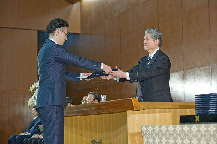 The 2018 Postgraduate Degree Conferral Ceremony was held on Wednesday, March 28, in the "Hiyoshi Kaido" Senior High School Gymnasium. The ceremony was this year held at Hiyoshi Kaido due to the reconstruction work currently underway at the site of the regular venue, the Hiyoshi Commemorative Hall. A total of 1,607 postgraduate degrees were conferred in the current academic year on students from 14 graduate schools (204 doctoral, 1,238 master’s, and 165 professional degrees.)