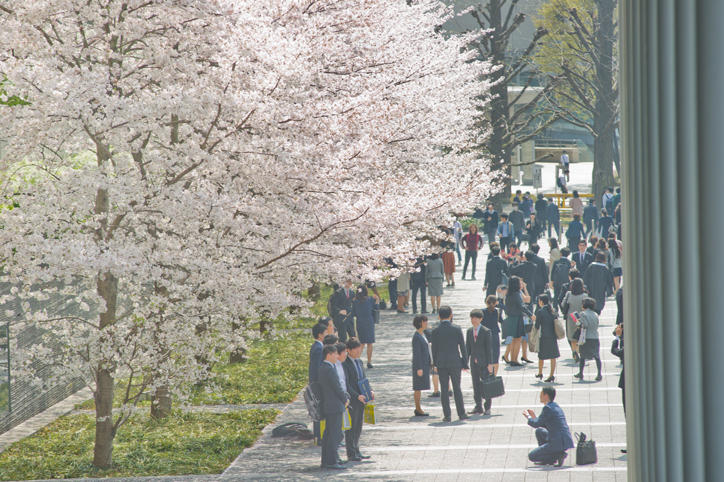With the warm weather and sunshine arriving in March this year, the flowers have begun to bloom earlier than usual. Below the cherry blossom trees in full bloom and swaying in the gentle spring breeze, graduating students and many other people were seen taking photographs of the petals dancing down towards the ground. Now, fresh new buds and leaves are starting to grow and are welcoming the new students.
