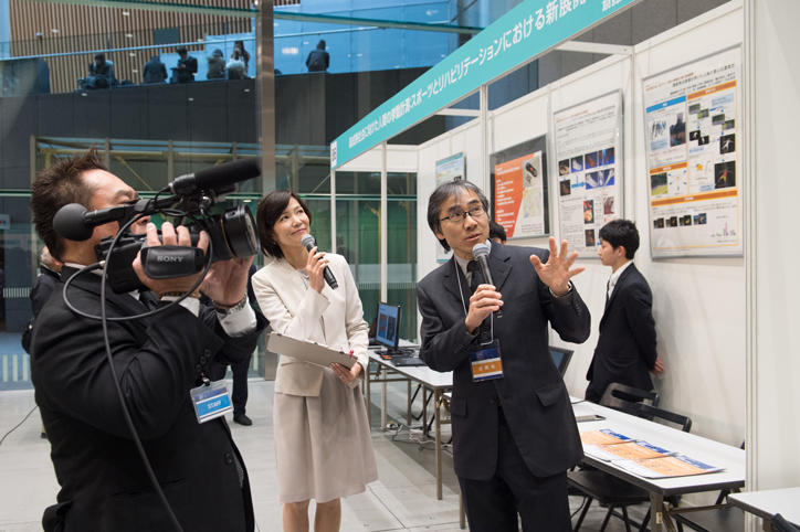 The exhibition venue, in addition to around 100 booths and panel exhibits, hosted group exhibits by researchers of the Chemicals Groups and the Medical-Engineering Collaboration. While there is a time-honored tradition of research being implemented in cooperation between the Faculty of Science and Technology and the Faculty of Medicine, this year’s event saw booths exhibited jointly by Keio University’s Faculty of Medicine and Faculty of Science and Technology in domains in which they particularly excel, including cognitive science, robotics, and rehabilitation. These were intended to highlight research outcomes and technologies of the Medical-Engineering Collaboration. In addition to the presentations by researchers in the Faculty of Science and Technology, in particular those in the Chemicals Group, panel discussions led by faculty members from the School of Medicine and the Faculty of Science and Technology were also held at the two short presentation spaces located within the exhibition venue, with attendees at the venue stopping by to listen attentively. Video relays of interviews with exhibiting researchers who are currently in the spotlight for their innovative or topical research outcomes were again held this year.