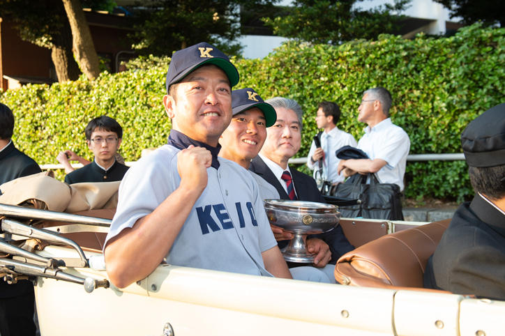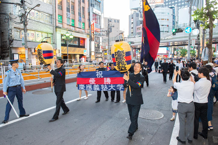 Following the end of the closing ceremony, a victory parade made its way from Meiji Memorial Picture Gallery in Mejijingu Gaien to the Mita Campus, where victory celebrations were held. Around 1,000 people took part in the parade and around 1,500 Keio students and jukuin (alumni) joined the victory celebrations and shared in the jubilation of the first consecutive league triumph in 27 years.