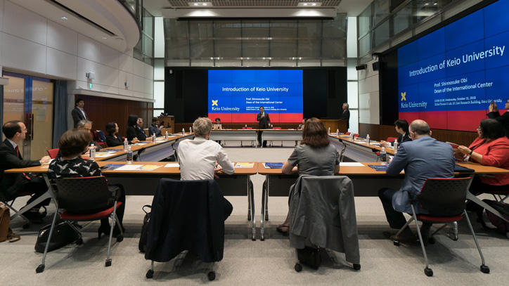 On Wednesday, October 31, representatives of Universities UK International (UUKi) and UK Universities visited Keio’s Mita Campus to exchange ideas on international cooperation at their respective institutions. The representatives were joined by members of the British Embassy in Tokyo for a presentation on Keio’s global outlook by Prof. Shinnosukue Obi, the Dean of the International Center. Then, Prof. Jiro Kokuryo, Vice-President for International Collaboration facilitated a Q&A session.