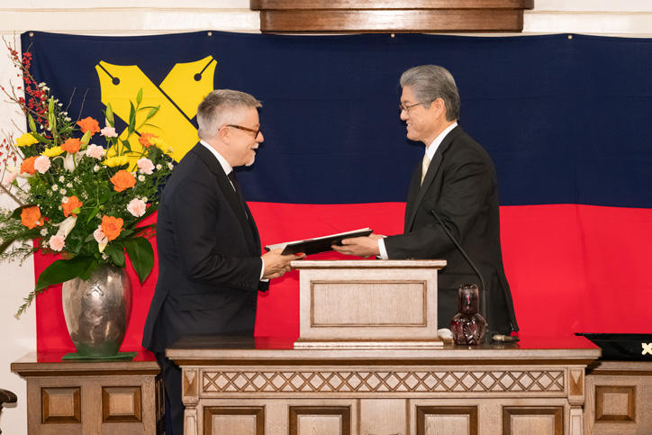 At the conferral ceremony, the strains of the Wagner Society’s rendition of the Alma Mater "The Juku-ka" rang out as Mr. Brown made his entrance, with Professor Keiko Okawa of KMD serving as the master of ceremonies, and Dean Masahiko Inakage reading the citation. Next, President Haseyama delivered a formal address at the ceremony after conferring the Doctorate Honoris Causa upon Mr. Brown, who responded with an expression of his gratitude.