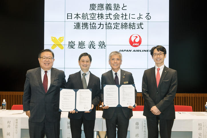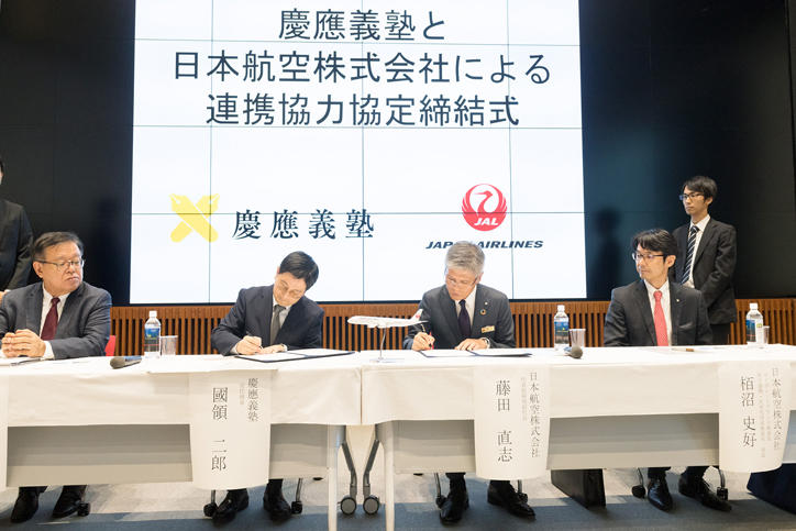 A signing ceremony was held between Keio University and Japan Airlines Co., Ltd. (JAL) at Mita Campus on Thursday, September 20, attended by Keio Vice-President Jiro Kokuryo and JAL Representative Director and Executive Vice President Tadashi Fujita, among others.