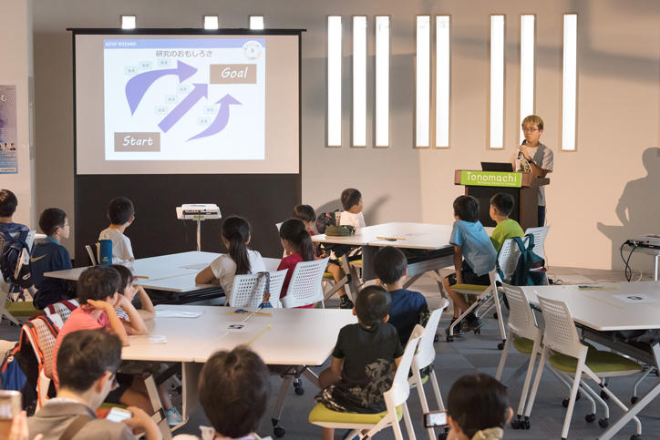 Tonomachi Town Campus hosted three booths: "The Junior Doctor Marshmallow Tower Experience!"; "Understanding Programming by Game Design"; and "Let’s Make Our Own Rods and Catch Fish!" This year, the advanced course "JST Junior Doctor Cram School" led the way as a platform for interim research presentations by the participating junior high school students. This was followed by "The Junior Doctor Marshmallow Tower Experience!" for elementary school students and their guardians, who were each assigned roles such as moderator. The participating children could be seen getting to grips with the games by trial and error and intently listening to the presentations by the junior doctors.