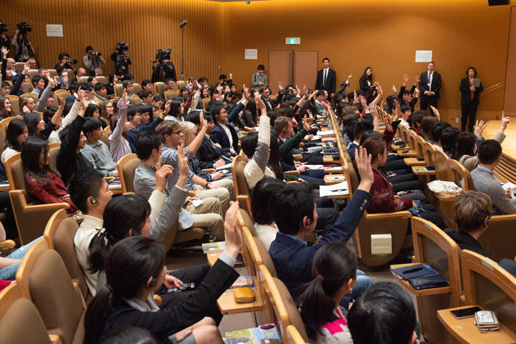 Following President Haseyama’s introduction, Chancellor Merkel expressed her delight at the opportunity to speak to Keio students, inviting them to query her about any issue they might have in mind. Students posed pointed questions on an array of topics, from mutual challenges of Japan and Germany and educational policy, through to dilemmas relating to technology including AI, personal data, and global security issues, resulting in lively and engaging interactions between the Chancellor and the enthusiastic attendees.