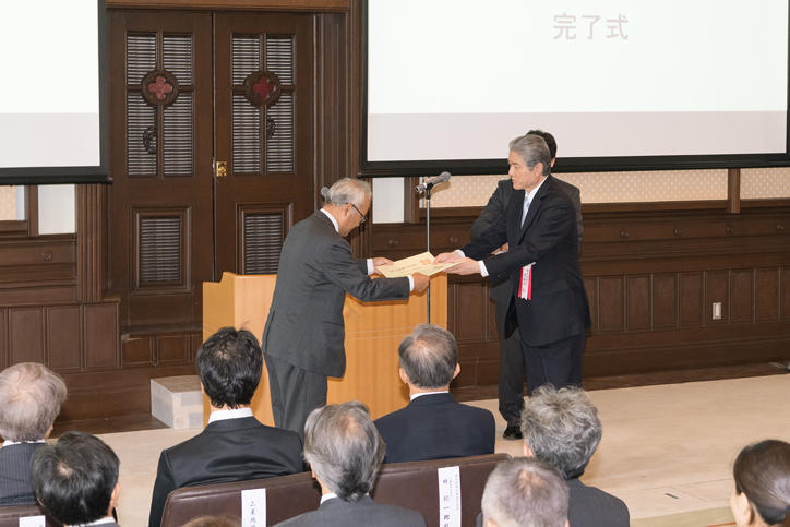 To mark this occasion, a presentation of letters of appreciation from Keio to the designers, supervisors, and construction workers involved in the restoration, and the presentation of an inventory of presents to the designers and supervisors was conducted, with more than 50 relevant persons from Keio in attendance alongside persons involved in the design and construction work. President Akira Haseyama gave a speech during which he expressed his gratitude to all those involved in the restoration work, while sharing reminiscences of his university days in the Old University Library. He also conveyed his hopes that the building would become a facility to allow the history and culture of Keio to be passed on to future generations.