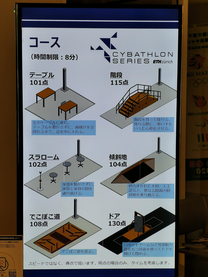 The CYBATHLON Wheelchair Series Japan 2019 was a competition for total points obtained by completing the six challenges below within the designated time limit (8 minutes). This is not a competition of speed, and the time taken to reach the goal is only taken into account when teams obtain the same number of points.