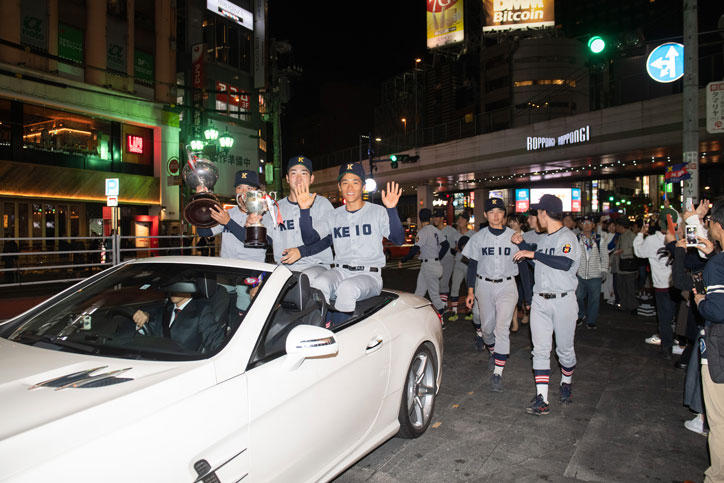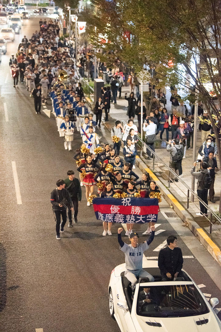 After the closing ceremony, a parade from the Jingu Stadium to Mita Campus was held followed by a victory celebration at the campus. About 750 people took part in the parade and around 2,000 people, including Keio students, alumni, and those from the neighboring areas, participated in the victory celebrations and shared in the joy of winning the tournament.