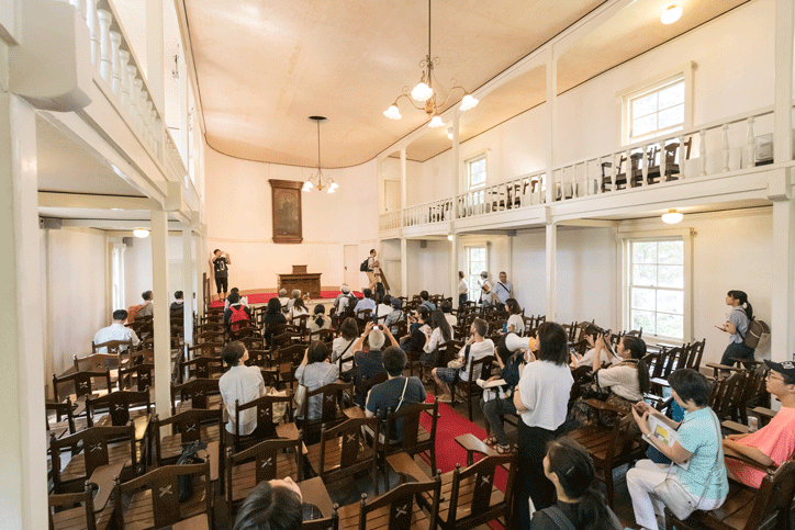 Participants could be seen throughout Mita Campus taking in the included facilities or posing for photographs with a map in one hand, as the Mita Enzetsu-kan (Mita Public Speaking Hall) and Ex Noguchi Room on the 3rd floor of the South Building, which are not normally not accessible, and the interior of the Old University Library, to which access is normally limited, were opened to the public. They could also be seen chatting with the curators, who fielded various questions about the history of the respective buildings and other matters, during and after the guided tour, held on both days.