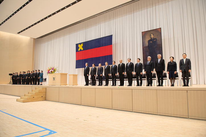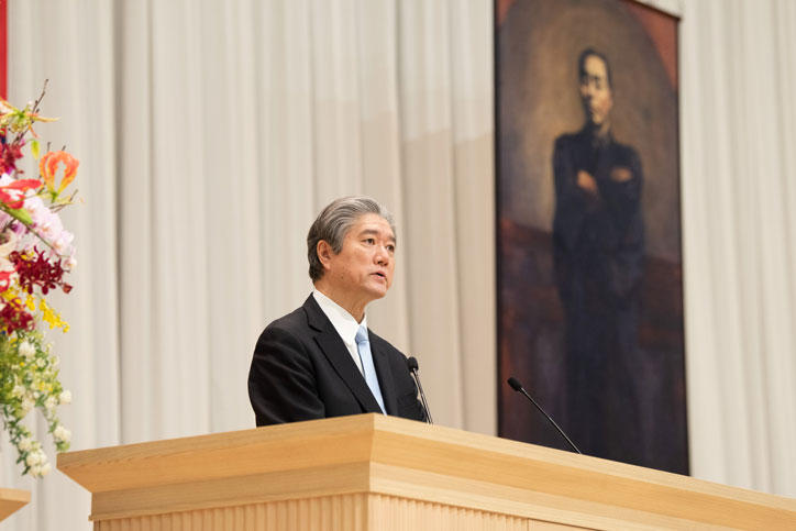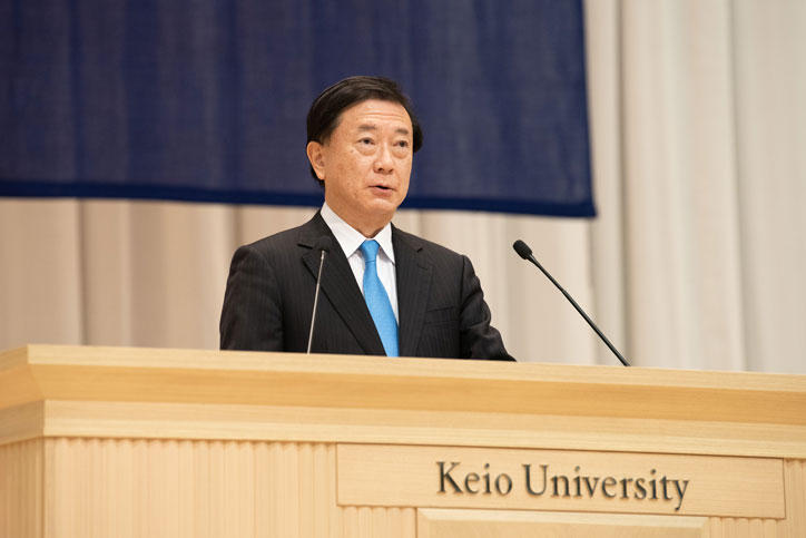 Next, Professor Hirokazu Kono of the Graduate School of Business Administration gave a congratulatory address on behalf of the faculty and staff members, and the ceremony came to a conclusion with the singing of Alma Mater, "The Juku-ka."