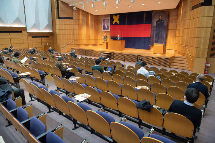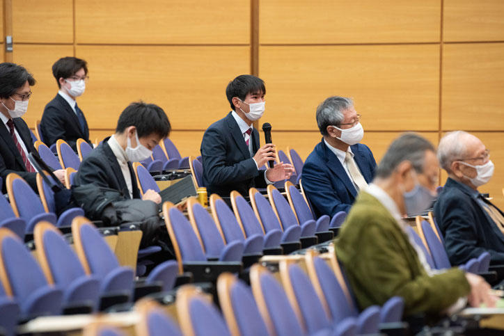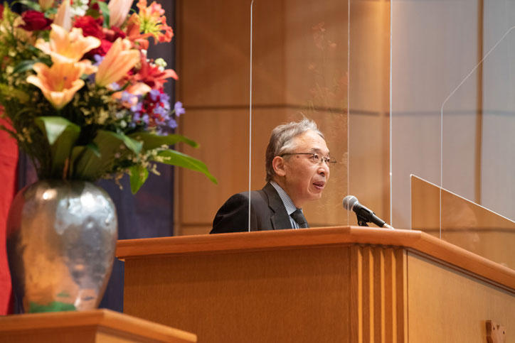 While the traditional venue for the lecture has been the Mita Public Speaking Hall (Mita Enzetsu-kan), it was this year held at the West School Building Hall in a format which maintained appropriate seating distance in order to prevent infections by COVID-19 (coronavirus disease), and the audience listened attentively to the lecture at this venue.