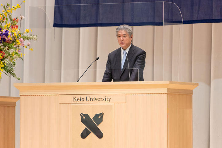 The AY 2021 Undergraduate Entrance Ceremony was held at the Hiyoshi Commemorative Hall on Thursday, April 1, 2021. It was the first time that the ceremony has been held on Hiyoshi Campus since 2017. A total of 6,462 students newly became members of the Keio community, joining the 10 undergraduate faculties and Japanese Language Program.