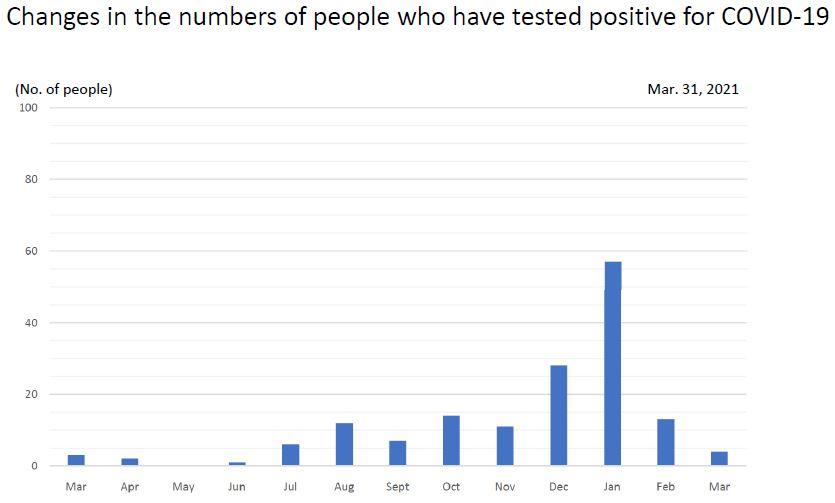 Number of people reported to have tested positive as of the end of March, 2021 (cumulative total)
