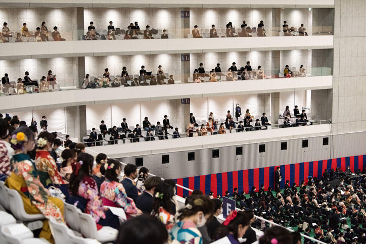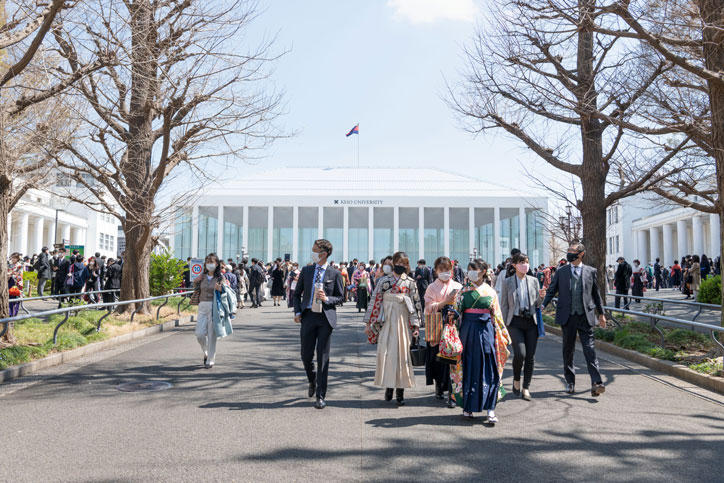 On Tuesday, March 23, 2021, the undergraduate commencement ceremony for the 2020 academic year was held as the first formal event at the venue of the New Hiyoshi Commemorative Hall since its completion in March 2020. A total of 6,189 graduates (217 correspondence course students) from 10 undergraduate faculties celebrated this new departure.