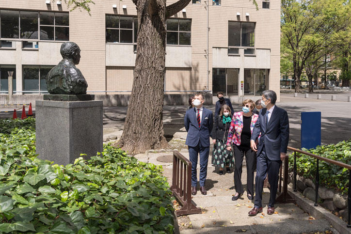 On Saturday, April 16, Dr. Katalin Karikó, a researcher at BioNTech who was instrumental to the development of the mRNA vaccines that are now used throughout the world to stop the spread of COVID-19, and H.E. Dr. Norbert Palanovics, Ambassador of Hungary, visited Mita campus to meet with President Itoh and Vice-President Amagai.