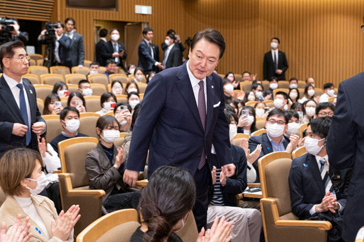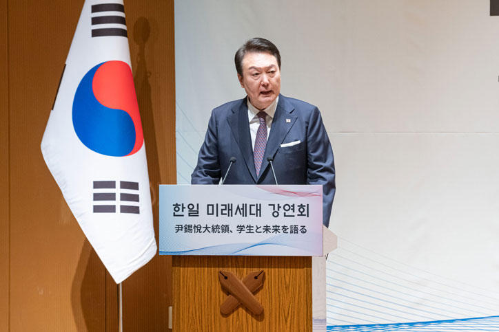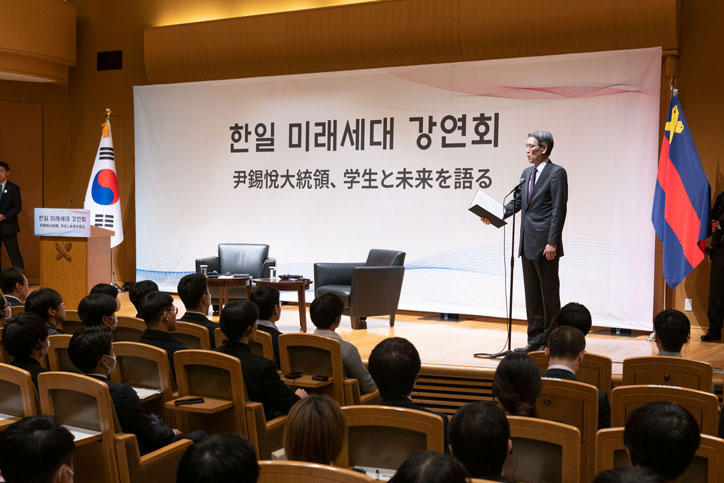 Following a welcome address by Keio University President, Kohei Itoh, President Yoon took the stage and spoke to an audience of about 150 students, including exchange students from South Korea. In his speech, President Yoon said he had been looking forward to meeting the future generation of students and emphasized the importance of active, cross-cultural exchanges between the youths of Japan and Korea. He called on students to be courageous in building a brighter future.