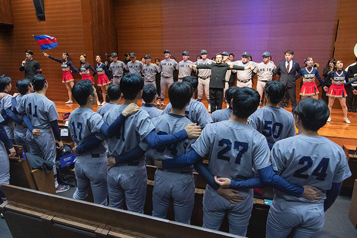 The celebrations began with the endless cheers and support of the crowd watching the parade, an enthusiasm which then carried over into the official ceremony. The Keio Cheer Group kicked things off with a performance and President Kohei Itoh welcomed everyone to the ceremony. Then he, Professor Takaaki Kato, the faculty advisor for the Baseball Club, Head Coach Tetsuya Horii, and Captain Ryuta Hirose celebrated with a Japanese sake barrel ceremony known as "Kagami-biraki." The baseball club members were also brought up to answer some questions from the crowd. At the end of the ceremony, the school flag was raised on stage as everyone joined together to sing the school songs, "Keio Sanka," "Oka no Ue," and "Wakaki-chi."