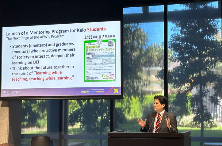 On September 25, Vice-President Tsuchiya delivered a presentation titled "Equity, Diversity and Inclusion (DEI) Initiatives at Keio University" in which he introduced various initiatives and programs such as the Keio Mentoring Program, the International Women's Day workshop co-hosted with the University of Melbourne, as well as the DEI Symposium where female faculty members who had participated in the APRU Asia-Pacific Women in Leadership (APWiL) Mentoring Program shared their experiences, DEI strategies, resources, and goals via presentations, a moderated panel discussion, and a Q&A session with participants.