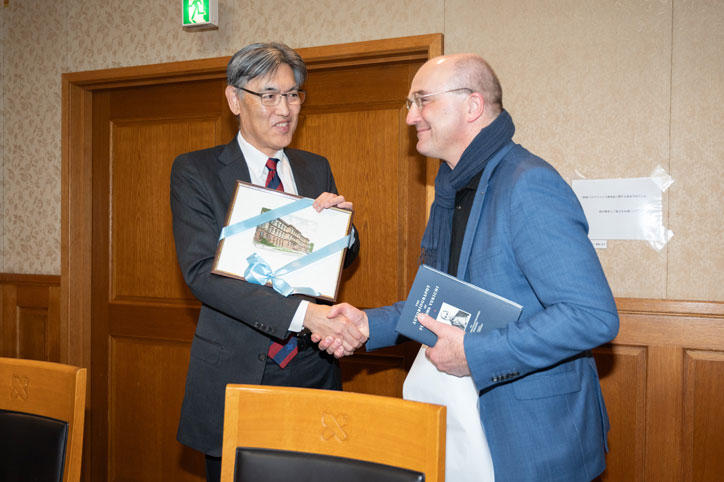 In the morning of the day of the visit, President Kohei Itoh, Vice-President Masayuki Amagai, and others, welcomed the delegation at Mita Campus. Rector Rüdiger expressed his gratitude for making this visit possible, and President Itoh reiterated his appreciation for the long history of exchange and friendship between both universities. Following that, both universities shared information and exchanged opinions on the current status of research and education at each university respectively. The discussion session was held amidst a lively atmosphere from beginning to end, with both sides posing multiple questions beyond the scheduled time. Both sides affirmed their commitment to continue strengthening their cooperation, especially in research, towards 2026, which would be the 70th anniversary of the start of exchanges between the two universities.