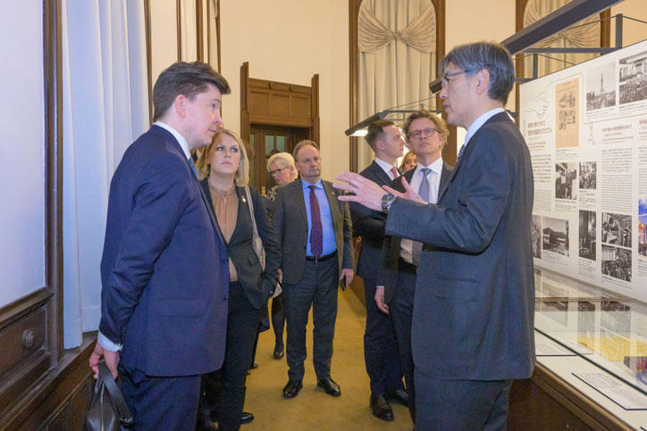 On February 5, a visiting delegation led by Speaker of the Swedish Parliament, Andreas Norlén, together with the Swedish Ambassador to Japan, Pereric Högberg, and the president of the Okinawa Institute of Science and Technology (OIST), Karin Markides, visited Mita Campus.
