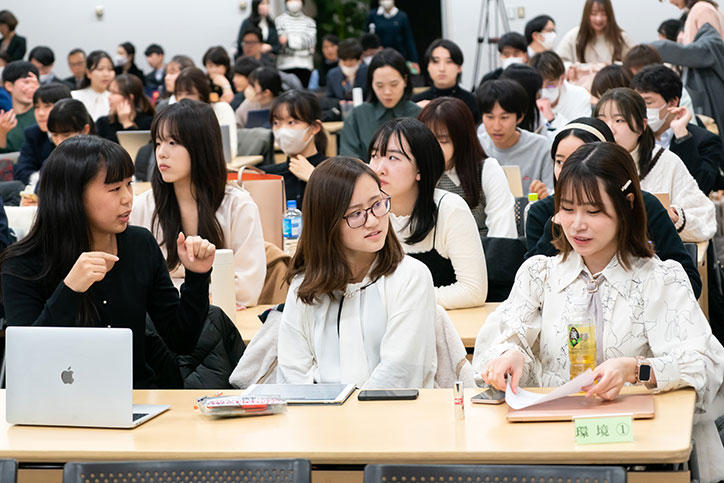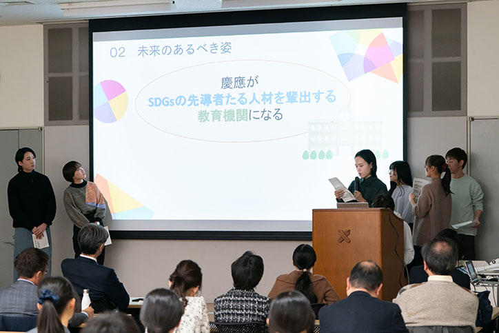 The students' multifaceted presentations introduced possible actions Keio could take to address the challenges it faces on the path for Japan and the world to create a better future. Then, President Itoh took the lead in providing feedback to the students, sparking an in-depth discussion in which the students were able to dive into the issues even further and share their thoughts. The proposals covered a wide range of topics that included waste reduction, connecting with the local community, energy conservation, education, and diversity. These powerful ideas reflected a year's worth of study, as well as the insights the students reflected on through their daily lives while gaining a heightened awareness of social issues.