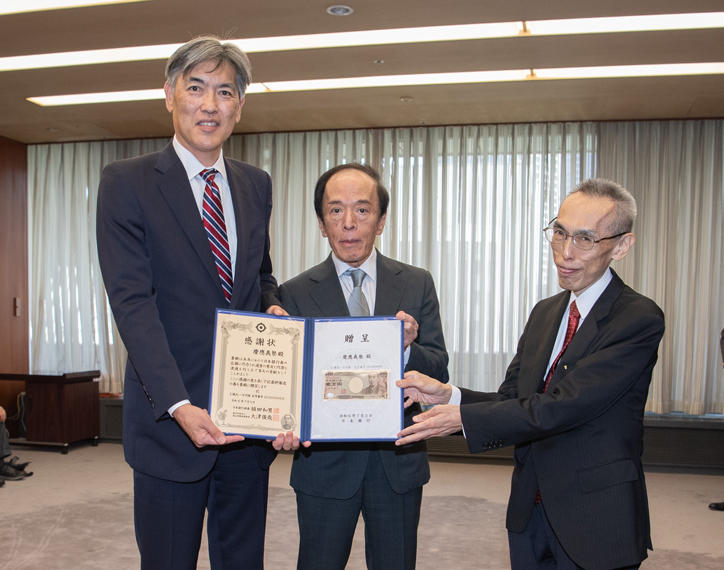 On July 3, a ceremony was held at the head office of the Bank of Japan where Kazuo Ueda, governor of the Bank of Japan, presented the final 10,000 yen note printed with the old design to Keio University President Kohei Itoh. Keio University had previously received the two other designs with the portrait of its founder, Yukichi Fukuzawa, printed on it―one from the 1984 series and the other from the 2004 series―from the Bank of Japan. Governor Ueda expressed his appreciation for Keio University's longstanding cooperation in publicizing the banknotes, such as through the commemorative exhibition of the second series of the 10,000 yen note featuring the portrait of Yukichi Fukuzawa. Governor Ueda then personally presented to President Itoh a 10,000 yen note with the serial number "ZE300000X" from the final production lot of the 2004 series.