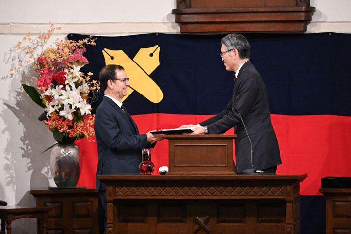 A ceremony to confer the title of Doctor Honoris Causa upon Dr. Fouad Bennis, Professor Emeritus of École Centrale de Nantes, was held at the Mita Public Speaking Hall (Mita Enzetsu-kan) at 3:45 p.m. on Thursday, November 6.