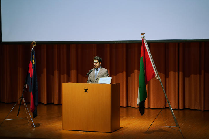At the inauguration event, the center welcomed H.E. Dr. Maitha bint Salem Al Shamsi, minister of state of the UAE. A ribbon-cutting ceremony and presentation of commemorative gifts were also held at the center, attended by Keio officials, embassy representatives, and other related parties. Afterwards, the venue shifted to the Kyoseikan Collaboration Complex where Keio University President Kohei Itoh gave his opening address. Then, Dr. Mohamed Binhuwaidin, Dean of the College of Humanities and Social Sciences at the United Arab Emirates University, gave an address as guest of honor for the ceremony. The event continued with a commemorative lecture by UAE Minister of State H.E. Dr. Maitha bint Salem Al Shamsi titled "Sheikha Fatima bint Mubarak: Trajectory of Her Ideals and Contributions" where she spoke about the various contributions Her Highness Sheikha Fatima has made toward the promotion of education, welfare, and culture, leaving a deep impression on the audience. After the lecture, Vice-President Akiyo Okuda gave an overview of the center and discussed the prospects of the center being utilized as a place of education in a broad range of applications. This was followed by a showcase of a variety of student performances that interweaved both Japanese and Arabic cultures, such as a presentation of creative works in Arabic, a Tsugaru-style shamisen (Japanese lute) performance, and an introduction to the Japanese tea ceremony. Finally, Vice-President Motohiro Tsuchiya delivered his closing remarks, drawing the successful event to an end. Other special programs were held during the week in conjunction with the ceremony, including an Arabic calligraphy workshop and an event offering Arabic cuisine, providing a rare opportunity for students, faculty, and staff members to experience Arab culture. Going forward, the Sheikha Fatima bint Mubarak Centre for Arabic Language Education will serve as a center for deepening mutual understanding and friendship between the Arab world and Japan, with Arabic language education as its main focus, while also functioning as a place for cultural exchange.