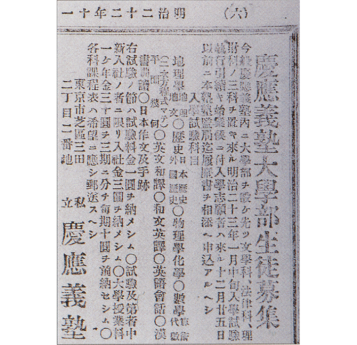 『慶應義塾改正規則摘要』に「各部第一学年に入るを得る者は本塾普通学科卒業証書を受領したる者、若しくは大学科入学試験に及第したる者とす」とあり、試験科目には「日本地理、万国地理、日本歴史、万国歴史、博物学、物理学及化学、数学(算術、代数学、幾何学、三角術)、英文和訳、和文英訳、英語・会話及書取、日本作文、図画(自在画)」が挙げられている。この当時は「尋常中学校卒業の程度」、「英語学科は本塾普通学科卒業の程度」であることが受験資格となっており、尋常中学校卒業者は、「英文和訳、和文英訳、英語会話及書取」の3科目の試験を受けなければならかった。さらに「入学試験を受くる者は入学申込の時定規の試験料を会計局へ納むべし」とあり、試験料は1円だった。