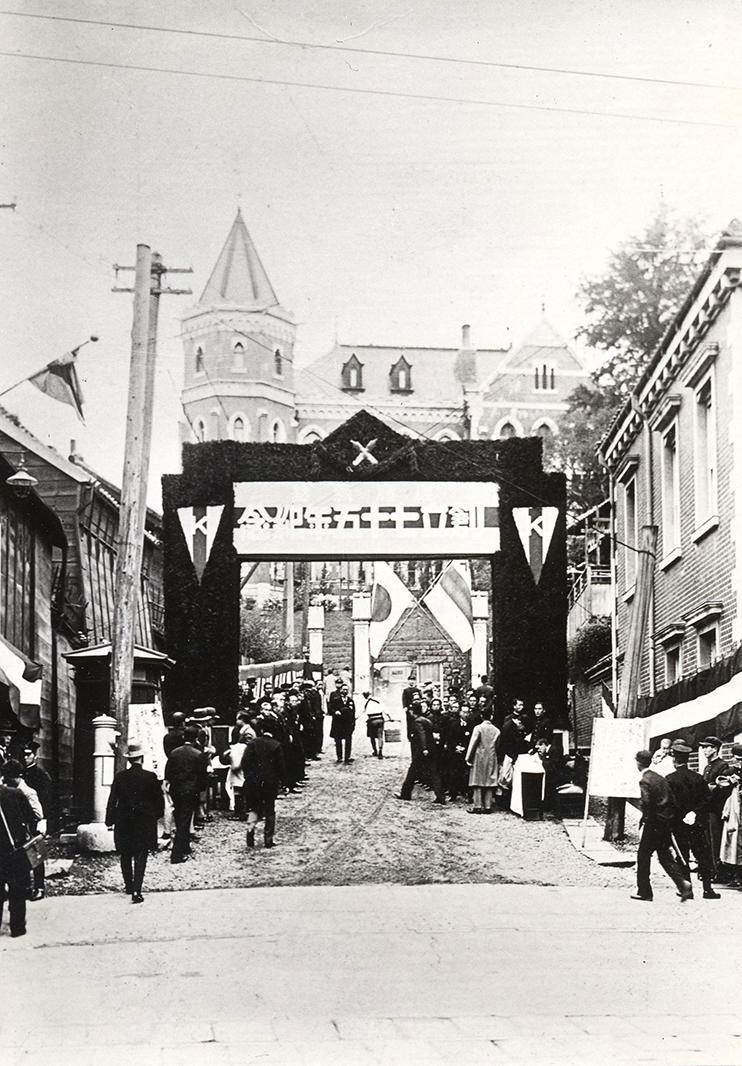 1907(明治40)年4月21日、義塾関係者等3000名余りが三田山上に集い、創立50年記念式典が盛大に挙行された。夕刻にはカンテラ行列が三田キャンパスからスタートし、銀座・日本橋を経て日比谷で解散。