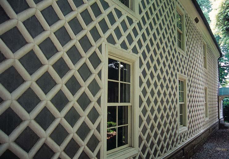 大公孫樹(おおいちょう)の前から大学院棟の脇を通ると見えてくる演説館は、グレーの地に白い斜め格子が入っているなまこ壁のたたずまいが、緑の下草に映えて美しい。歴史的建造物として、同じく重要文化財の指定を受けている図書館旧館が持つ威厳に満ちた雰囲気とはやや異なる。和洋折衷の造りのためか、それとも、建物自体がやや小ぶりのせいなのか、三田演説館はものものしさよりもどことなく、愛らしさを感じさせる。