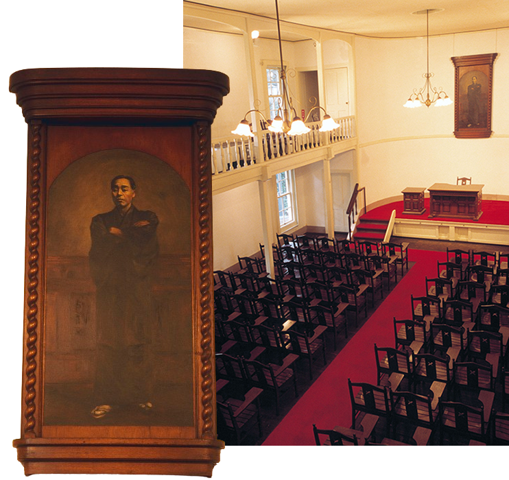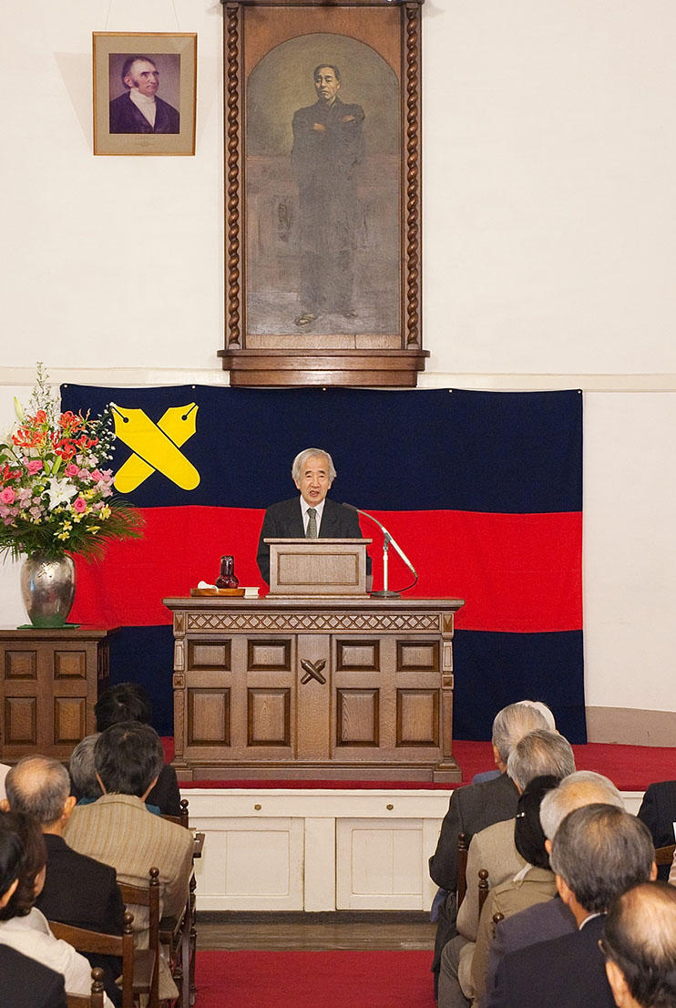 三田キャンパス内に建つ三田演説館は、日本最初の演説会堂である。1875(明治8)年に建てられた歴史的建造物であり、大正時代には東京府から史跡に指定され、1967(昭和42)年に国の重要文化財の指定を受けている。建築時は現在の図書館旧館と塾監局の中間あたりに位置しており、今は少々わかりづらいが正門左手の小高い丘(稲荷山)に移築されている。