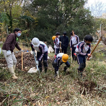 選択授業である「普通部の森」の授業は2001年頃から始まっています。私は2004年に慶應義塾大学の助手(嘱託)として初めて日吉に来たのですが、その頃から、普通部の森の授業に関わっており、もう20年になります。授業内容を一言で言うならば、蝮谷の斜面林(雑木林)の自然回復作業です。つまり雑木林の下草刈り、枝打ち、あるいは枯れた木があればクヌギ、エゴノキなどを植樹するなど、雑木林の管理をしながら、自然観察をする授業で、毎週土曜日に2時間森に足を運んでいます。