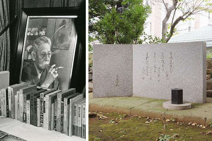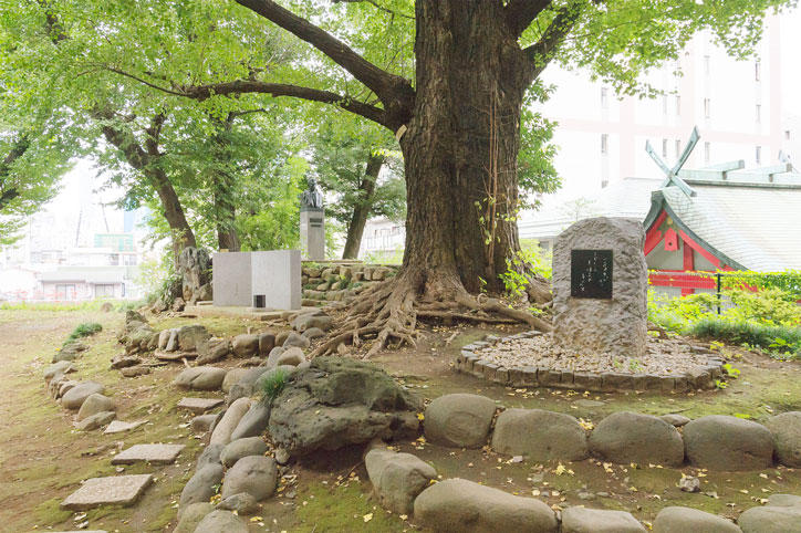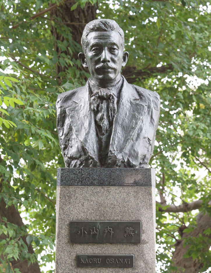 久保田万太郎の句碑にその名を記された「新劇の父」小山内薫。その胸像は、1958年に彫刻家の朝倉文夫により作られ、当初は歌舞伎座の別館売店前に設置された。