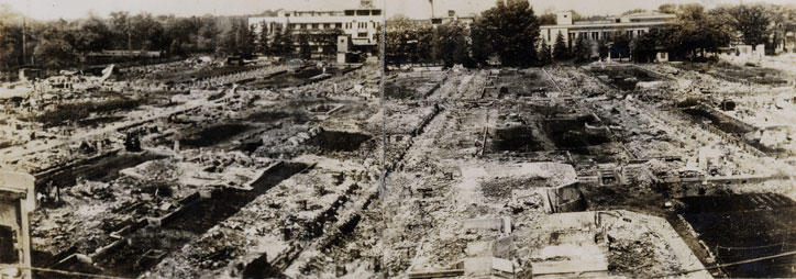 1945(昭和20)年5月24日未明〜25日、そして26日の2回にわたる米軍爆撃機による空襲で、三田キャンパスでは木造校舎のほとんどが焼失。塾監局や三田演説館などは焼け残ったが、慶應義塾のシンボルである煉瓦造りの図書館旧館は本館部分の閲覧室と事務室、そしてステンドグラスなどが失われた。被災に備え周囲の木造建築物を撤去していたことや、教職員や学生による懸命の消火活動により書庫は延焼を免れ、多くの貴重文献も疎開させており無事であったが、空襲の爪痕は大きかった。