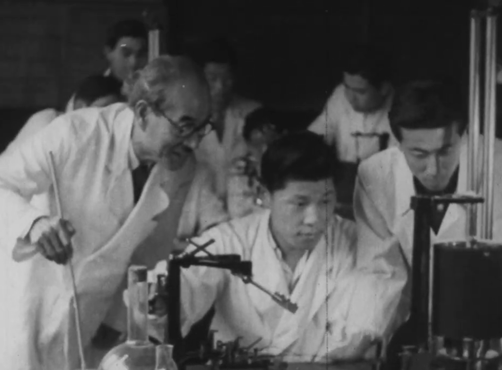 医学部、大学病院がある信濃町キャンパスは、1945年5月24日未明の空襲で施設の6割が焼失しました。災禍にもめげず、戦後まもなく武蔵野分校に移転し開講された基礎医学講座の授業で、加藤元一教授が医学生を指導する姿が残されています。加藤教授は、カエルの神経伝導の研究でノーベル賞候補に挙がったといわれる世界的な研究者です。加藤教授と教え子たちは、実験を支えたカエルたちを供養するために信濃町キャンパスにほど近い笹寺に蝦蟇塚(がまづか)を建立したことでも知られています。
