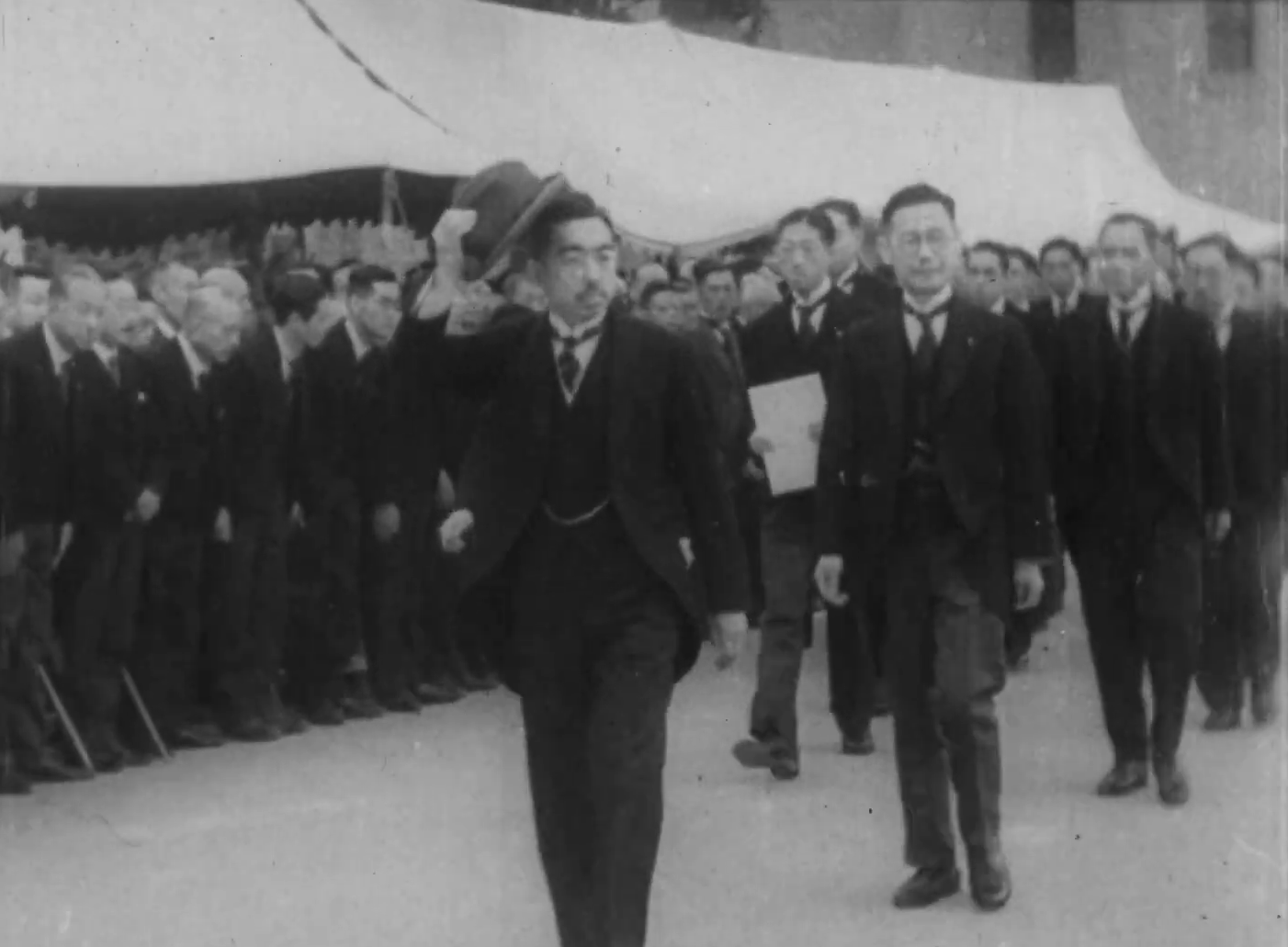 復興を強力に推し進めた潮田江次塾長の力強い式辞、塾員代表として登壇した「憲政の神様」尾崎行雄君による祝辞、さらには天皇陛下(昭和天皇)によるおことばといった貴重な映像が残っています。潮田塾長は式辞の中で、慶應義塾は創立以来あくまで民間として独立自尊の精神を実践し、その精神を世に布かんと努力を続けてきたことについて語っています。天皇陛下からは、「幾多の困難があると思うが、福澤諭吉創業の精神を心として、日本再建のため、一層努力することを望む」と、おことばを賜りました。私学として初の天皇陛下の行幸を仰ぎながら、式典を挙げる建物もなく、焼け跡の広場にテント張りの式壇を設けての開催であったことからも時代の苦難が偲ばれます。