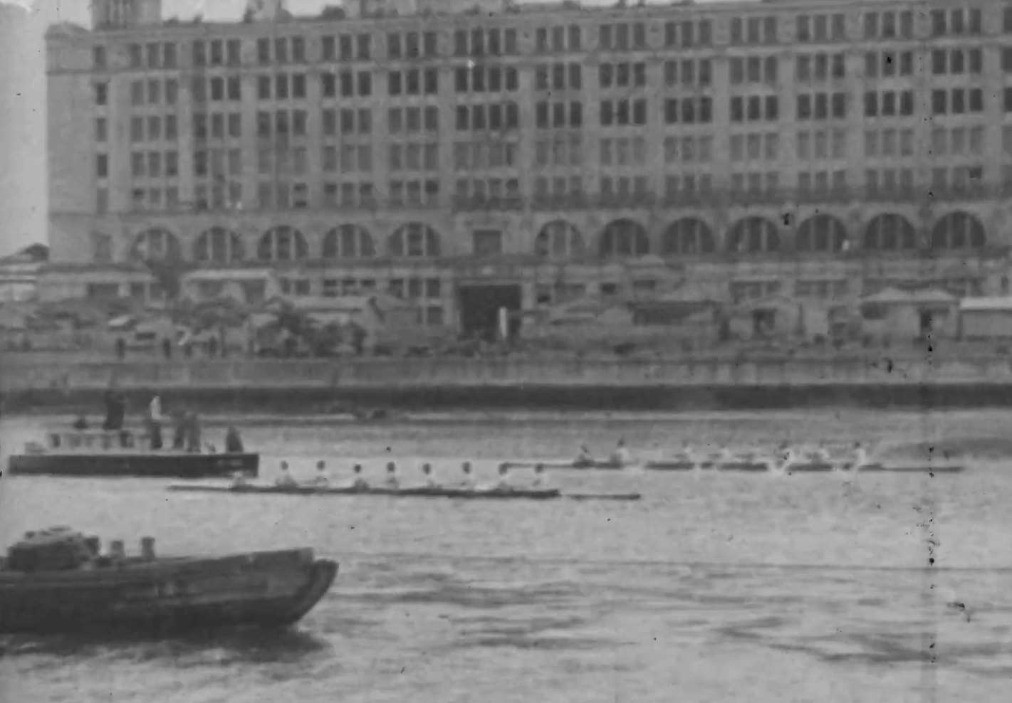1947年5月24日、晴天の三田山上で開催された創立90年の記念式典から始まるフィルム。なぜ創立100年ではなく90年なのか。ここにも戦争の影があります。空襲による三田、信濃町キャンパスの焼失と、米軍による日吉キャンパスの接収により、戦後の義塾は惨憺たる状況にありました。本格的な復興にはかなりの時間が見込まれましたが、10年後の創立100年を目標に、義塾復興の機運を醸成するため、盛大な式典を開催する決意をしたのです。義塾の威信をかけた創立90年祭は10日間にわたり開催されました。フィルムにはそのうちの式典と塾生による展覧会、音楽行進が収められており、早慶レガッタと野球の早慶戦で締めくくられています。