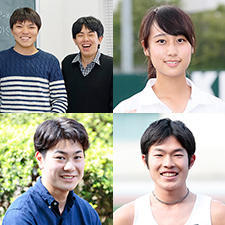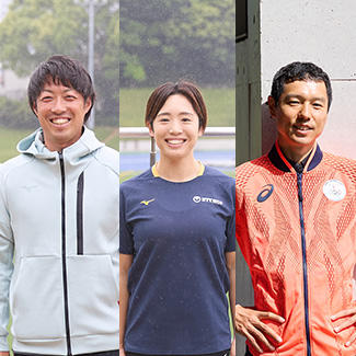 総合政策学部 水鳥寿思准教授、 陸上女子短距離選手 高桑早生君、競走部短距離ブロックコーチ 高野大樹君